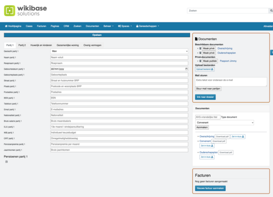 CSP BasisDe Wikibase Mediation suite draait op het CSP Basis framework. Het CSP Basis framework is een add-on voor MediaWiki die het mogelijk maakt om gebruik te maken van slots en page types. Met deze extra functionaliteit kunnen we de wiki overzichtelijk opstellen en informatie efficiënt bewaren. DossiersEen essentieel onderdeel van de Mediation oplossing is de mogelijkheid om cases/dossiers te maken. Bij elk dossier is het mogelijk om informatie van partners te bewaren, huwelijk en kinderen, gezamenlijke woning en overig vermogen. Daarnaast heeft elke case zijn eigen documentenkluis, facturen-overzicht en documentenoverzicht. Met het documentenoverzicht kan de mediator gemakkelijk documenten aanmaken. Deze documenten worden met variabelen direct aangepast, zodat documenten gegevens bevatten uit het dossier. Het is altijd mogelijk om meer gegevensvelden te maken indien gevraagd. |
